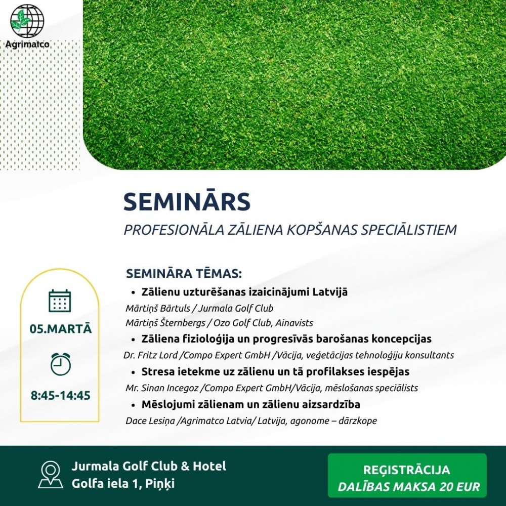 Ja ikdienā strādā ar zālieniem — golfa laukumos, sporta laukumos vai apzaļumošanas objektos — šis seminārs būs īpaši noderīgs. Praktiska pieredze, aktuālākās uzturēšanas metodes un starptautisku speciālistu zināšanas vienuviet.