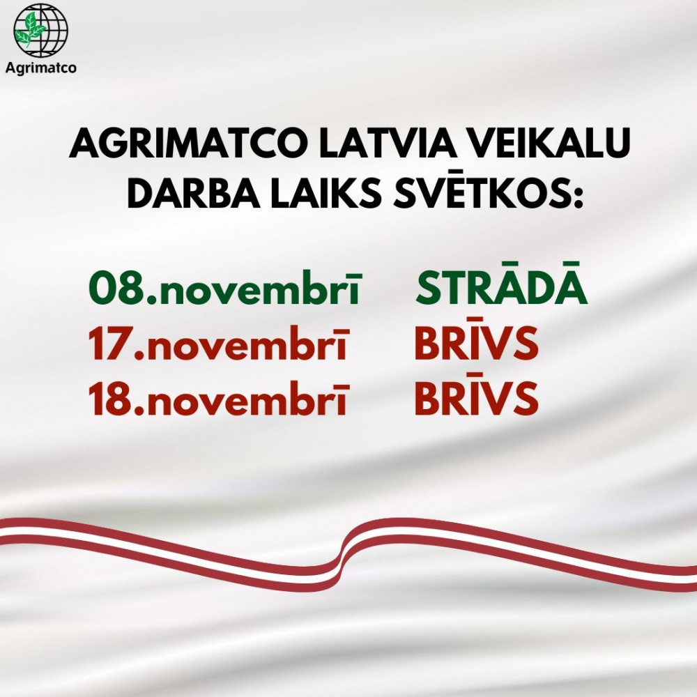 Informējam par Agrimatco Latvia veikalu darba laiku novembra svētku periodā: