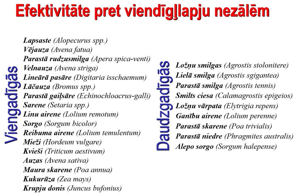 | Daudzgadīgās viendīgļlapju nezāles | 1.5 | Apsmidzināt kultūraugu sējumus vai stādījumus nezāļu 4-6 lapu stadijā, kad nezāles 10-15 cm garas |