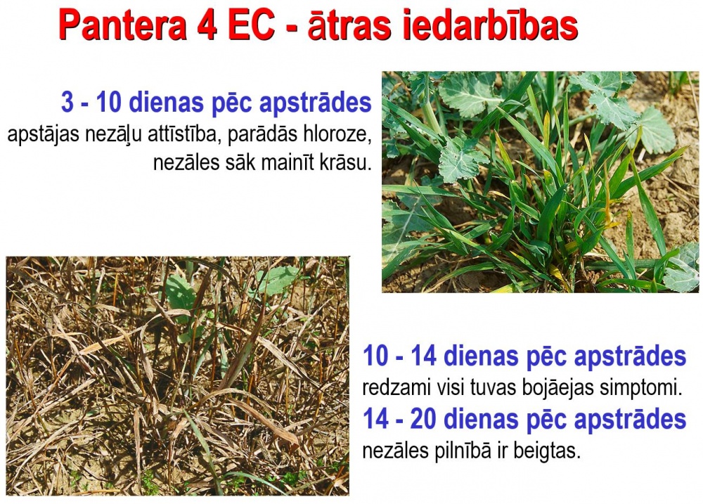 Pantera 4 EC - selektīvs, sistēmas iedarbības herbicīds pret labību sārņaugiem, vārpatu un citām viendīgļlapju nezālēm.
