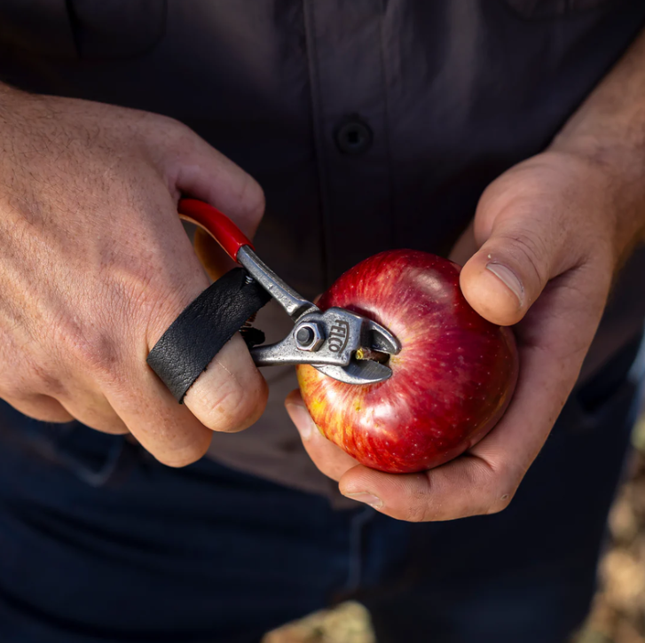 Karsti kaltais augstoglekļa tērauds nodrošina ilgu kalpošanas laiku un uzticamu griezumu arī intensīvā lietošanā. Ergonomiskā ādas siksniņa palīdz droši noturēt šķēres rokā un novērš to izkrišanu darba laikā, padarot augļu vākšanu ērtāku un ātrāku.