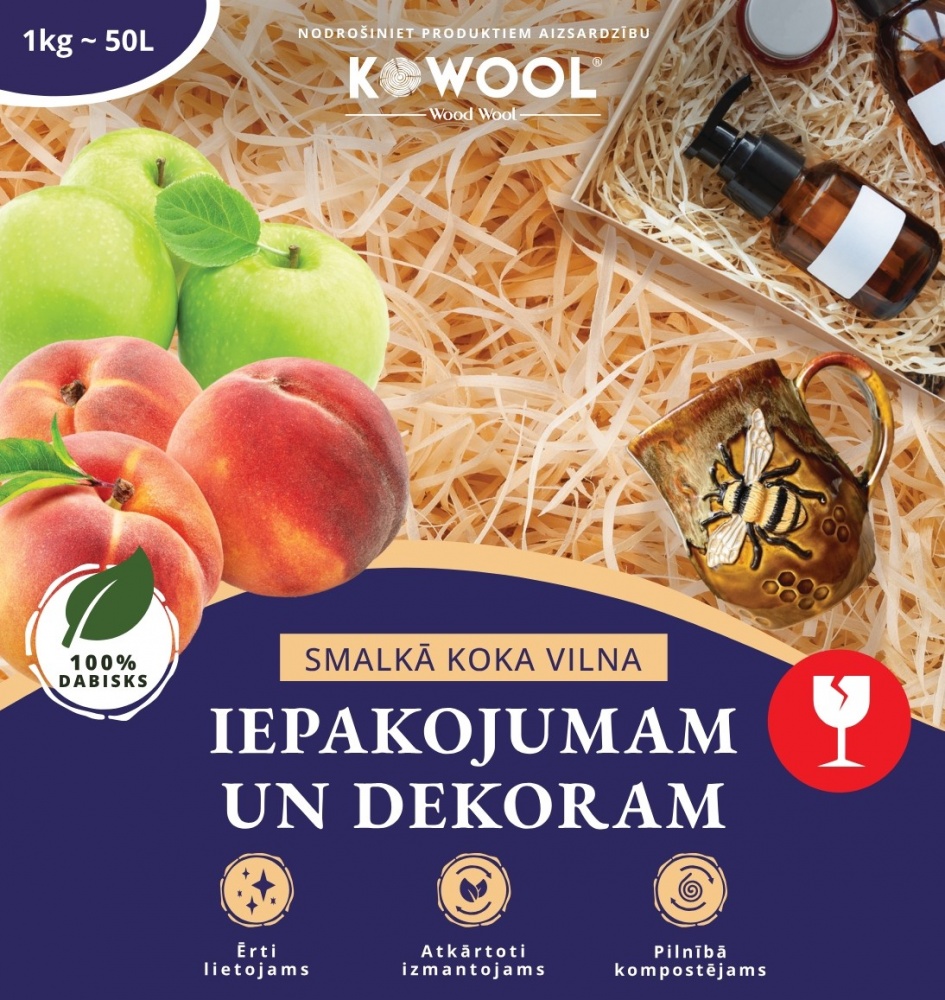 Smalkā KOWOOL koka vilna ir 100% dabīgs un drošs materiāls, kas paredzēts preču iepakošanai, aizsardzībai un dekorēšanai. Tā ir īpaši piemērota trauklu priekšmetu, dāvanu un pārtikas produktu iepakošanai, jo absorbē triecienus un palīdz uzturēt vienmērīgu mitrumu.