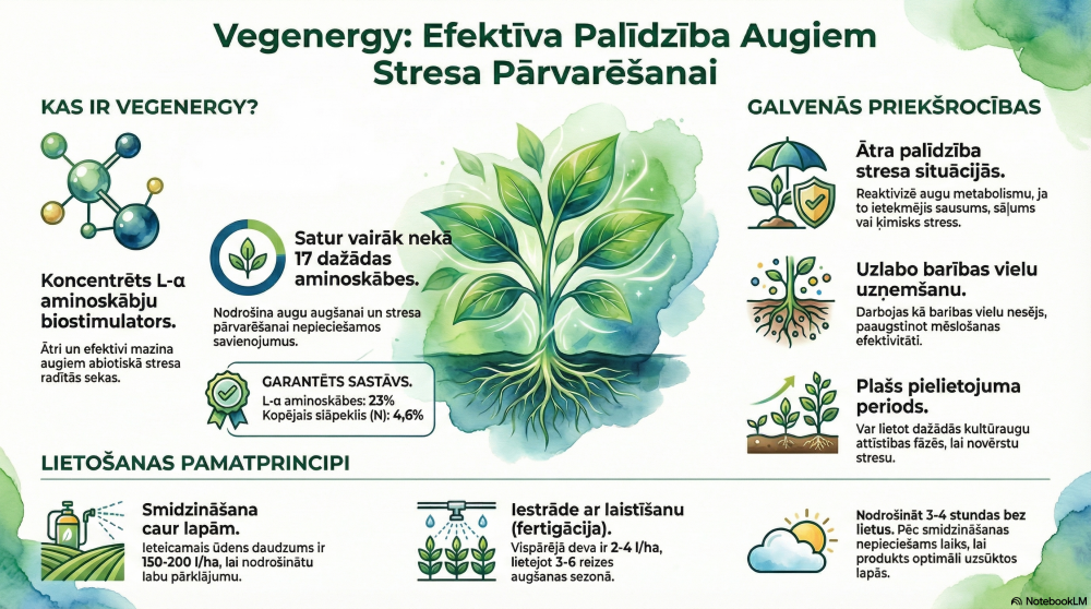 Vegenergy ir koncentrēts augu izcelsmes L-α brīvo aminoskābju biostimulators, kas paredzēts kultūraugu stresa mazināšanai, augšanas veicināšanai un ražas kvalitātes uzlabošanai. Produkts palīdz augiem ātrāk atjaunoties pēc nelabvēlīgiem apstākļiem un nodrošina efektīvāku barības vielu izmantošanu.