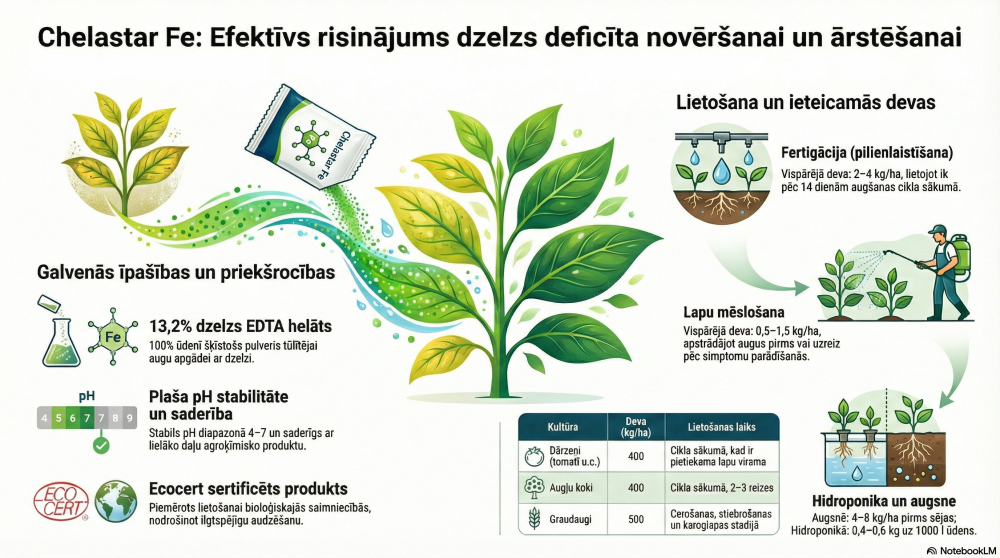 Chelastar Fe ir profesionāls EDTA helatēts dzelzs (Fe) mēslojums ar 13,2 % Fe, paredzēts efektīvai dzelzs deficīta profilaksei un korekcijai. 100 % ūdenī šķīstošs pulveris (WP) nodrošina ātru iedarbību un augstu barības vielas pieejamību augiem.