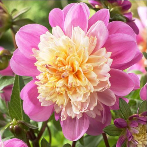 Dālija Take Off ir eleganta un ļoti dekoratīva šķirne ar maigi rozā ārējām ziedlapām un bagātīgu, krēmīgi dzeltenu centru. Šī kontrastējošā krāsu kombinācija piešķir ziedam apjomu un izsmalcinātu izskatu.